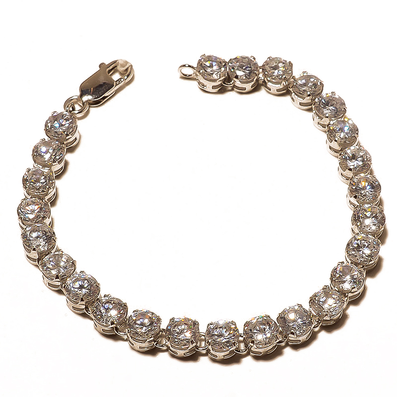 Featuring brilliant cut round zirconia stacked in a row, this one is matched with sterling silver base to easily match day and evening sets.