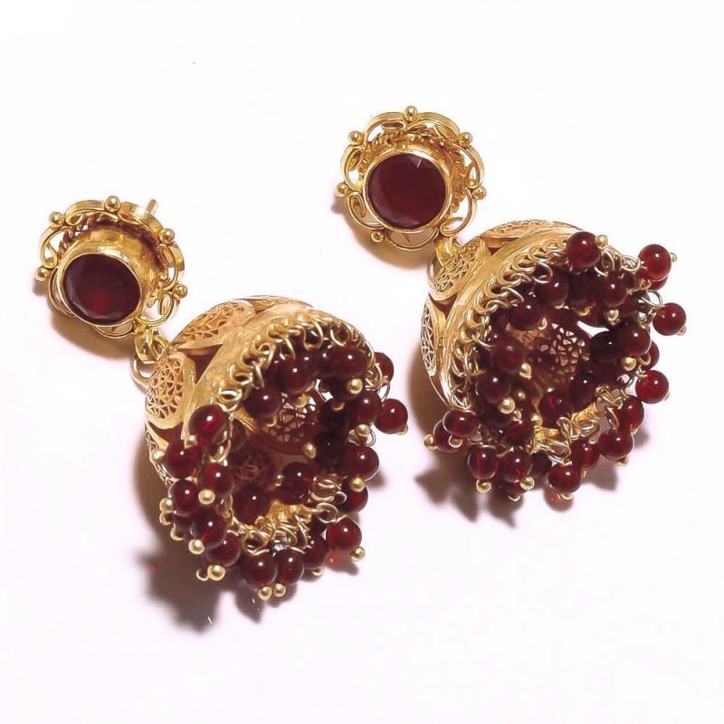 Classic handmade silver chandeliers with gold polish. Garnet on ear lobe and garnet beads on the bottom fringe gives it a festive look.